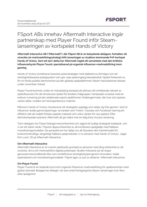 Aftermath Interactive AB (“Aftermath”), där FSport AB är en betydande delägare, fortsätter att utveckla sin marknadsföringsstrategi inför lanseringen av studions kommande PvP-kortspel Hands of Victory. Som ett led i detta har Aftermath ingått ett samarbete med den brittiska influencerbyrån Player Found, specialiserad på organisk influencer-marknadsföring inom gaming.